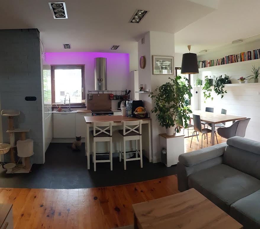 otwarty salon, połączony z kuchnią i jadalnią,