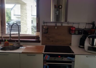 -holl. Kuchnia w zabudowie wyposażona w sprzęt AGD -lodówka i zamrażarka kuchenka płyta+osobny piekarnik, okap ,zmywarka ,filtr do wody. Meble kuchenne w kolorze białym, w połączeniu z naturalnym odcieniem blatów oraz kaflami na podłodze wywołują poczucie przytulności, idealnie wtapiają się w projekt wnętrza. Fragmenty cegły oraz drewniana podłoga- deski łącząca kuchnię z salonem, sprawia, że wystrój wnętrza jest konsekwentny i spójny kolorystycznie.
