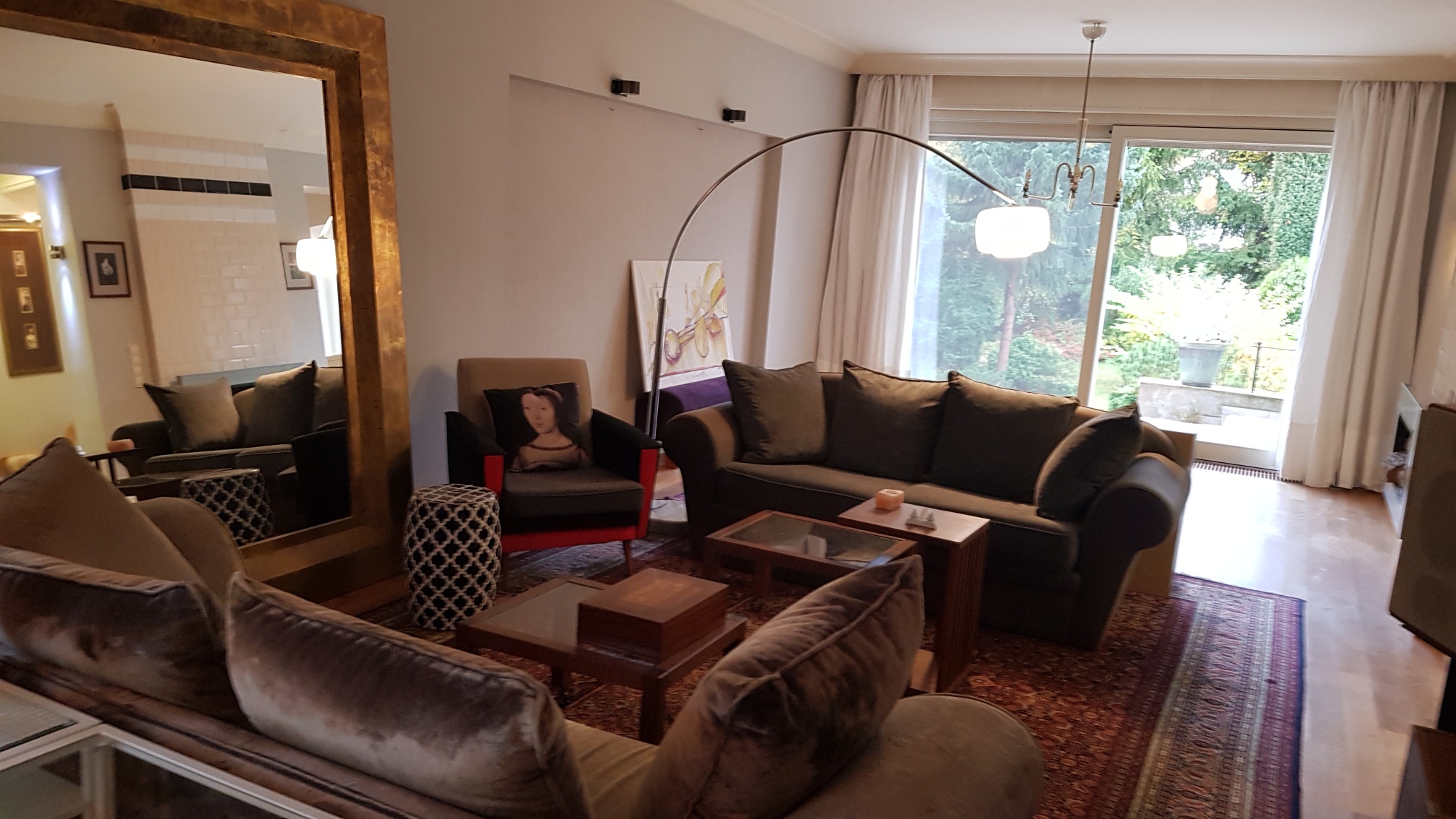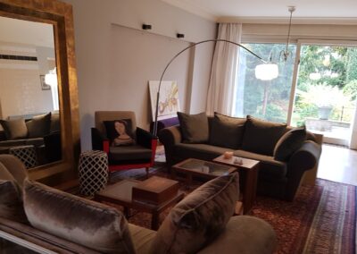 Apartament posiada duże przeszklenia (przesuwane na całej długości okna )od strony ogrodu co sprzyja wypełnianiu przestrzeni wewnątrz naturalnym światłem i otwarciu na piękny ogród.