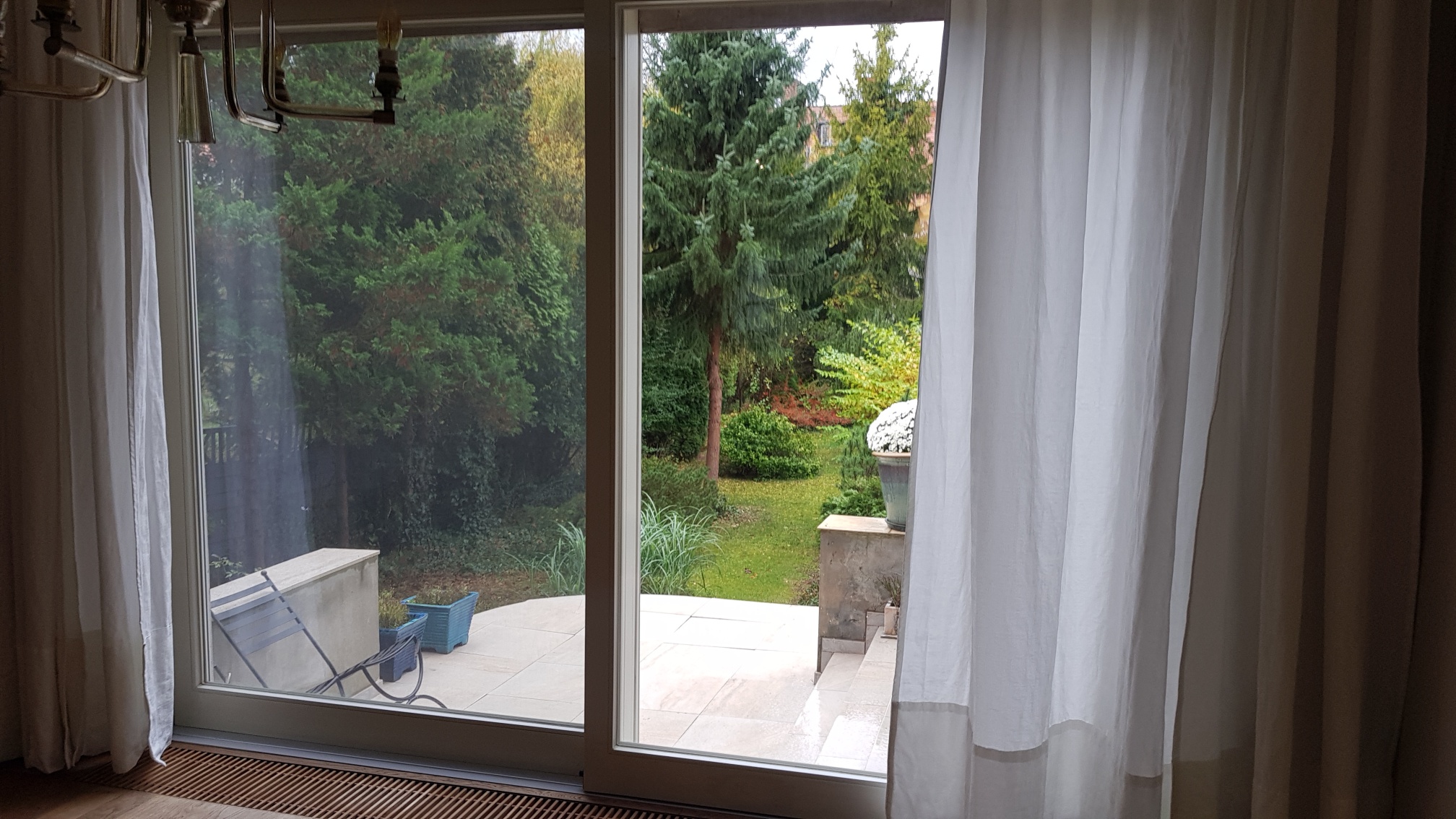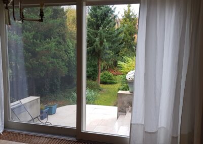 -okna wysokie drewniane(były wymieniane) rozsuwane od strony ogrodu