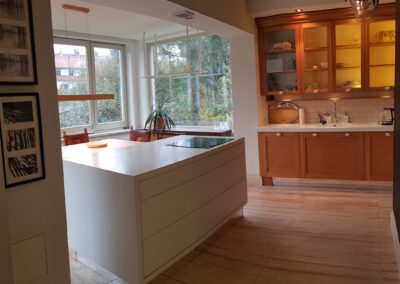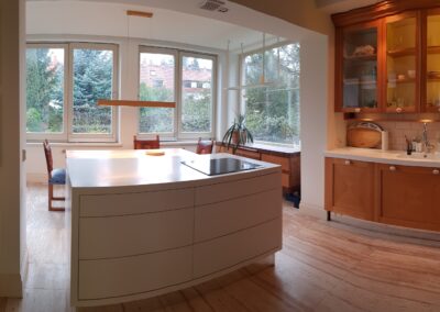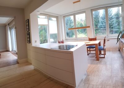 -kuchnia z oranżerią/jadalnią pięknie doświetlona światłem dziennym,w kuchni funkcjonalna wyspa z pojemnymi szufladami.